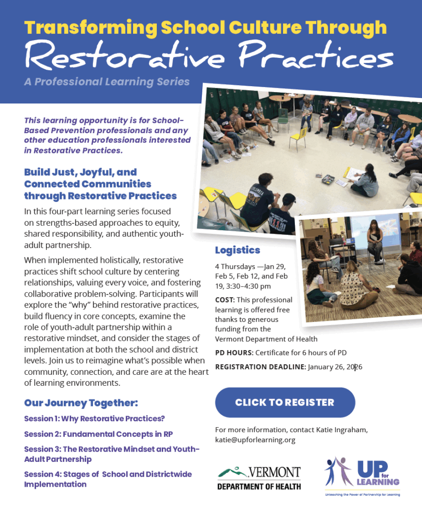 A representative team of youth in Vergennes MS/HS and adults will work with UP facilitators to build a vision for restorative practices at their school, including looking at current systems […]