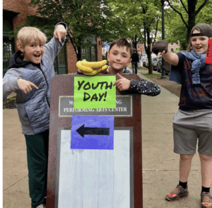 Three young boys point to a green sign that says Youth Day! in black block letters.